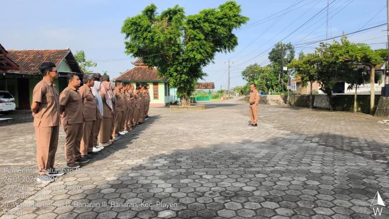 apel hari senin tanggal 26 januari 2025 di halaman balai kalurahan banaran .apel rutin dilakukan setiap hari senin pada pukul 08.00